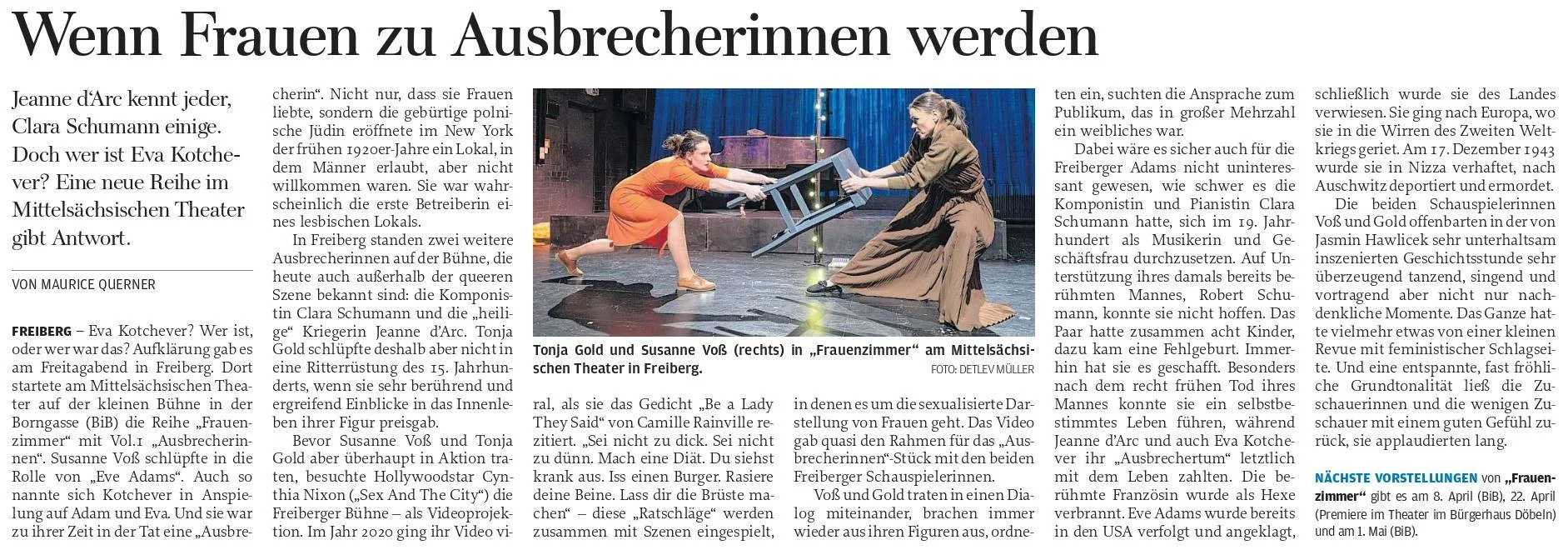 “Die beiden Schauspielerinnen Voß und Gold offenbarten in der von Jasmin Hawlicek sehr unterhaltsam inszenierten Geschichtsstunde sehr überzeugend tanzend, singend und vortragend aber nicht nur nachdenkliche Momente. Das Ganze hatte vielmehr etwas von einer kleinen Revue mit feministischer Schlagseite. Und eine entspannte, fast fröhliche Grundtonalität ließ die Zuschauerinnen und die wenigen Zuschauer mit einem guten Gefühl zurück, sie applaudierten lang.” Freie Presse; 04.04.23